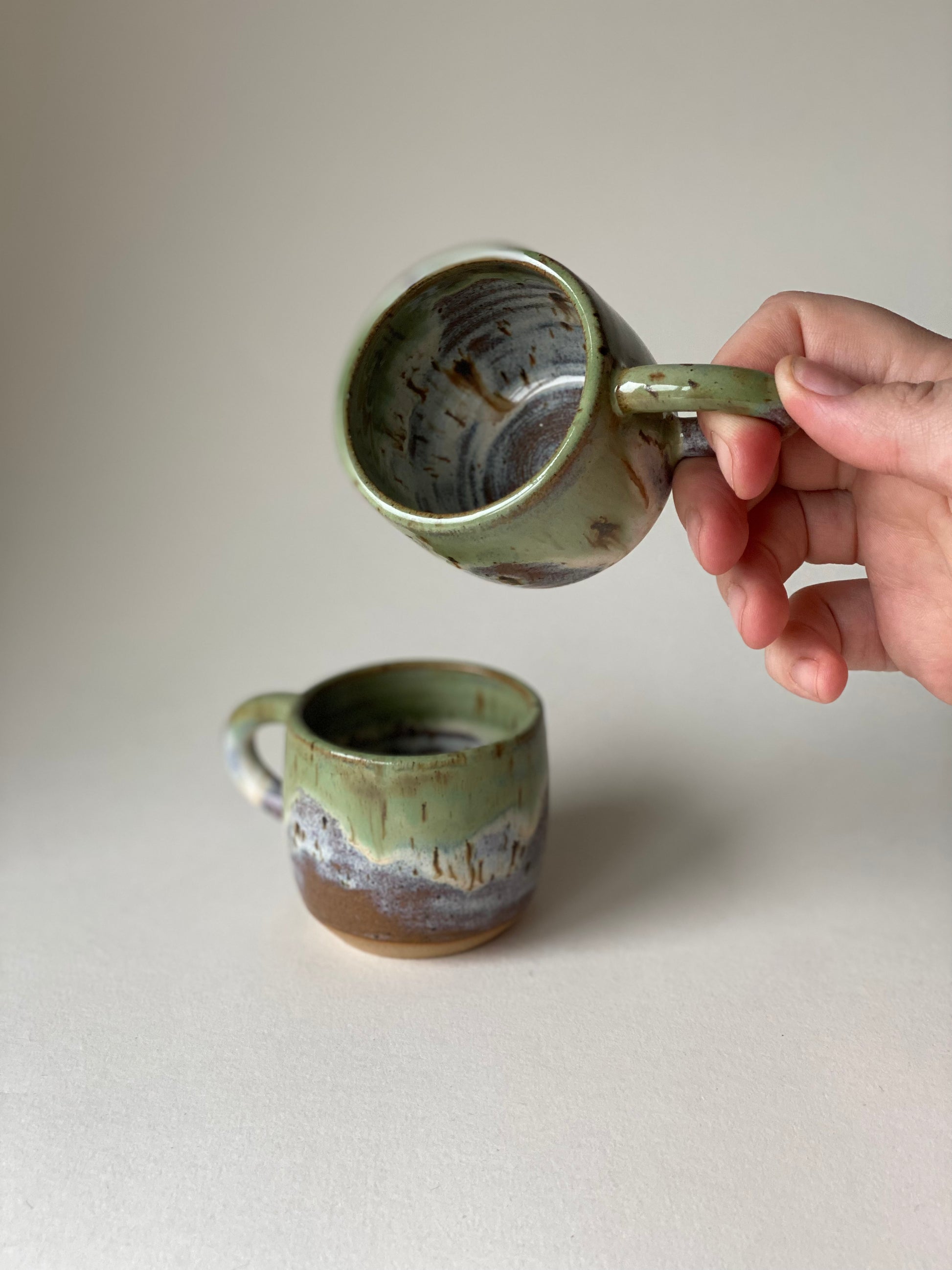 Hand-thrown stoneware espresso cup decorated in our Moss & Sand glaze combination.