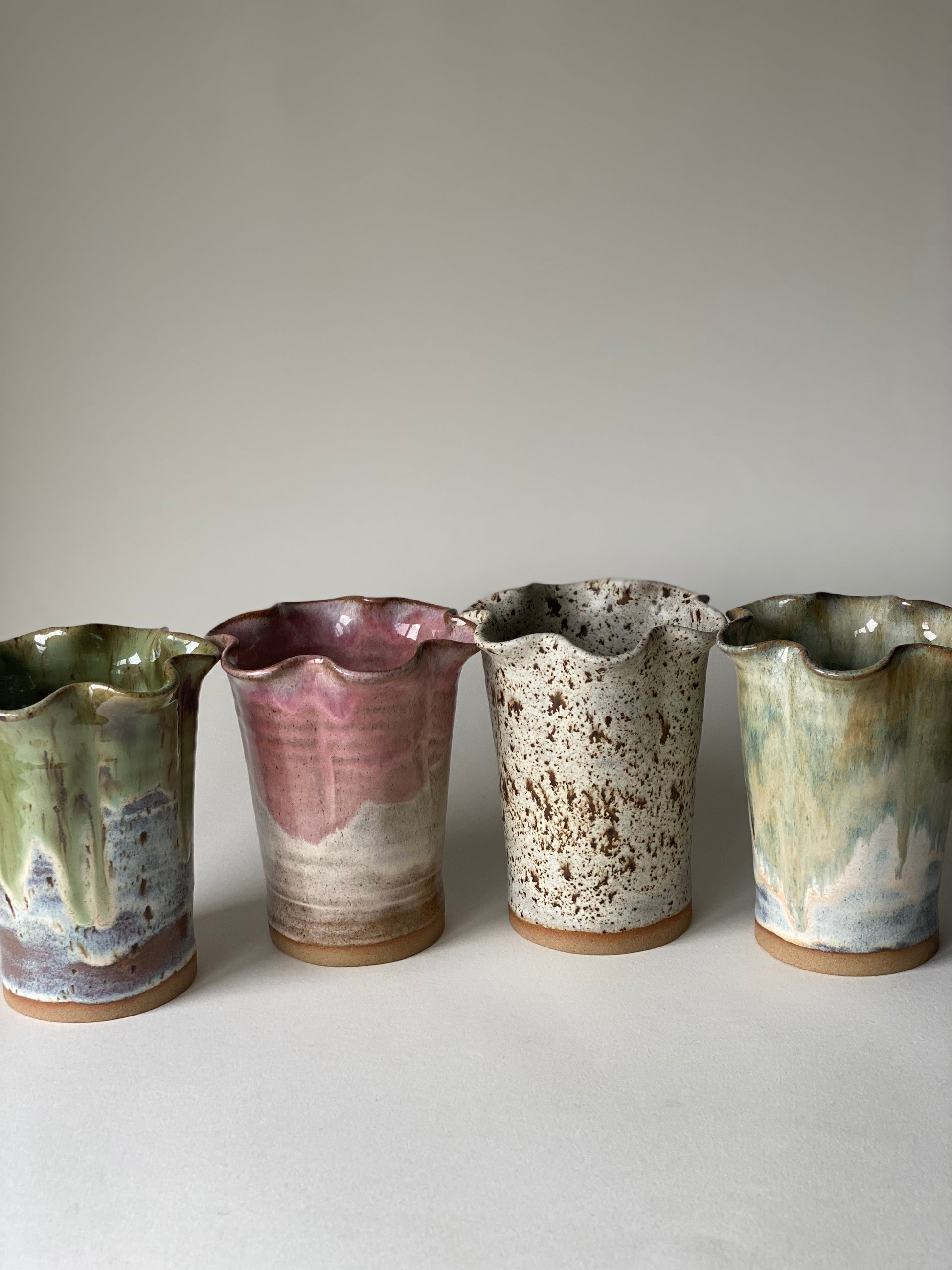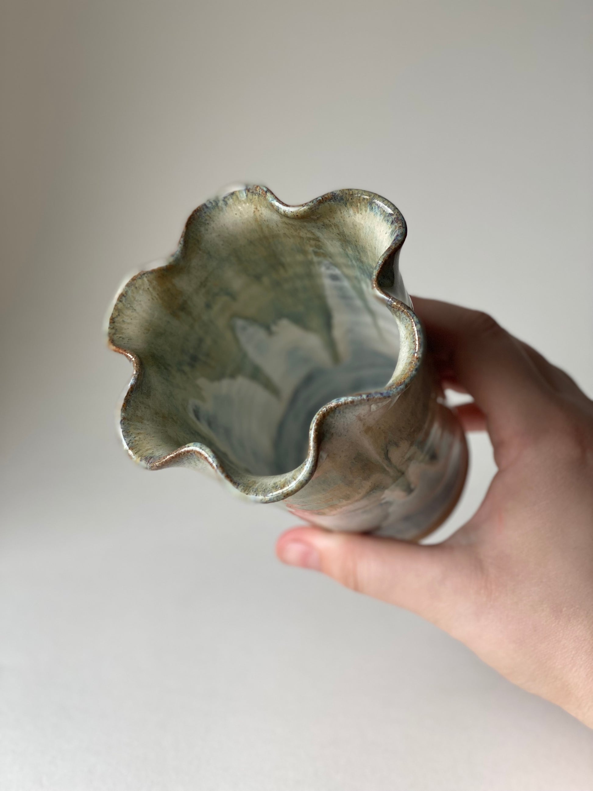 Hand-thrown stoneware frill flower vase in our eucalyptus cream glaze combination.