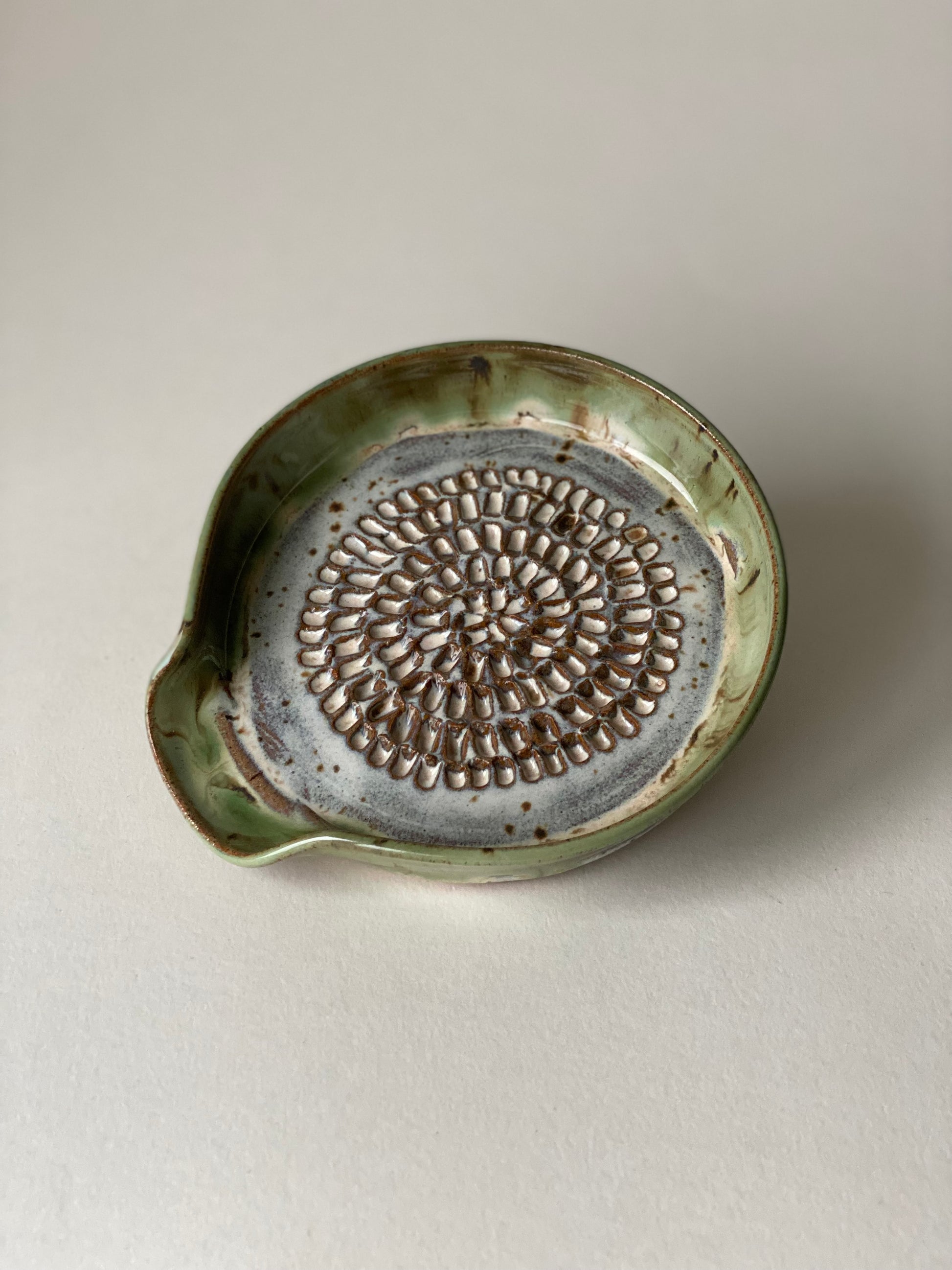 Hand-thrown stoneware garlic grater in our Moss & Sand glaze combination. This also doubles up as a spoon rest.